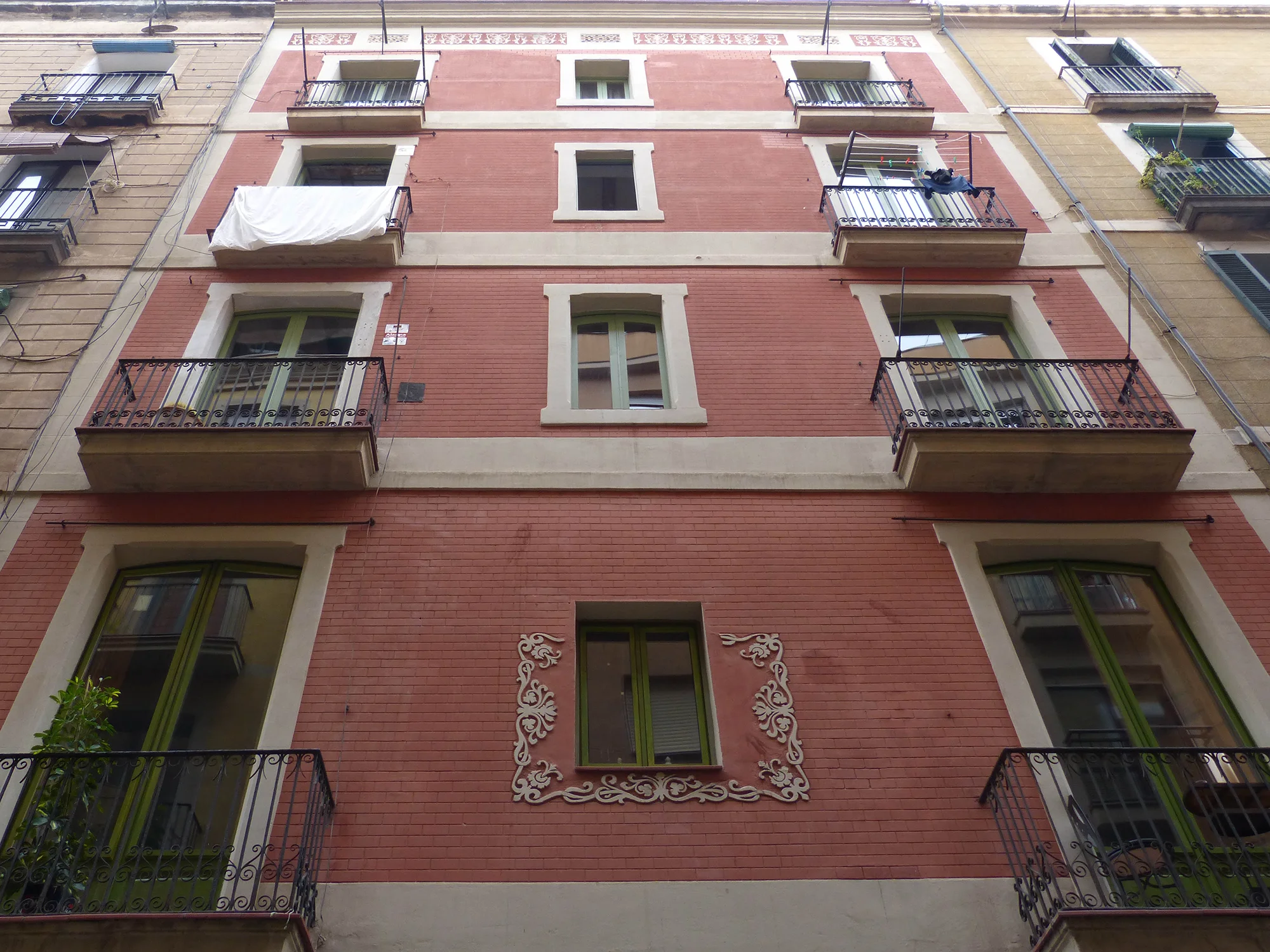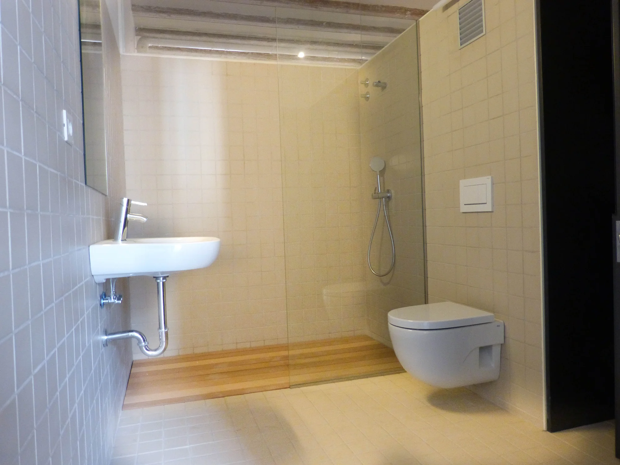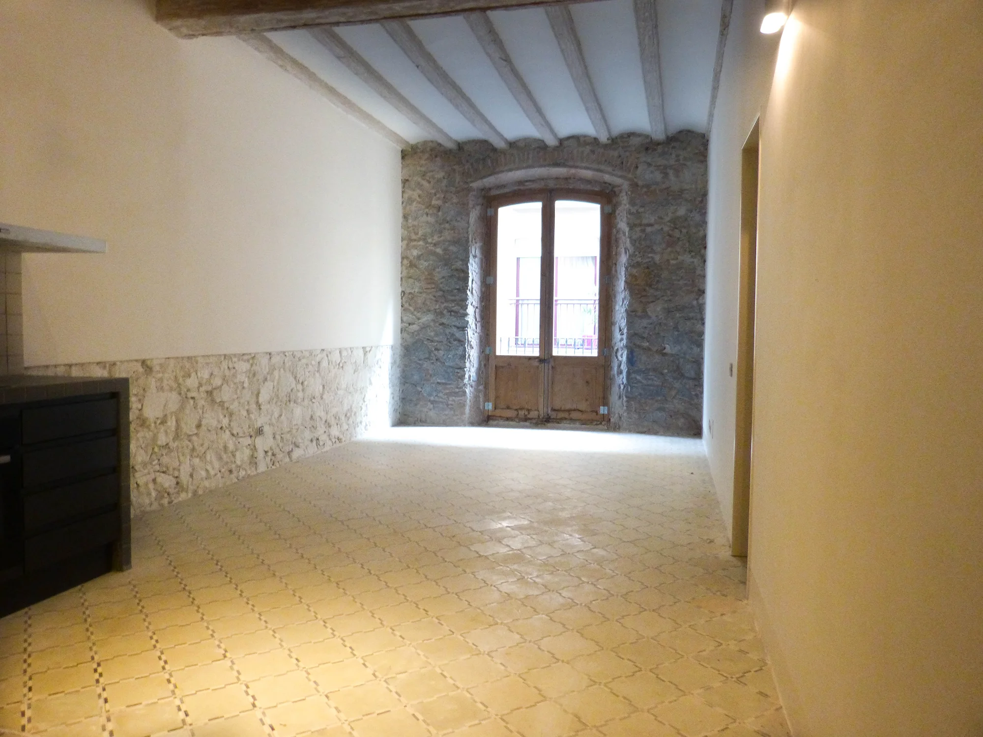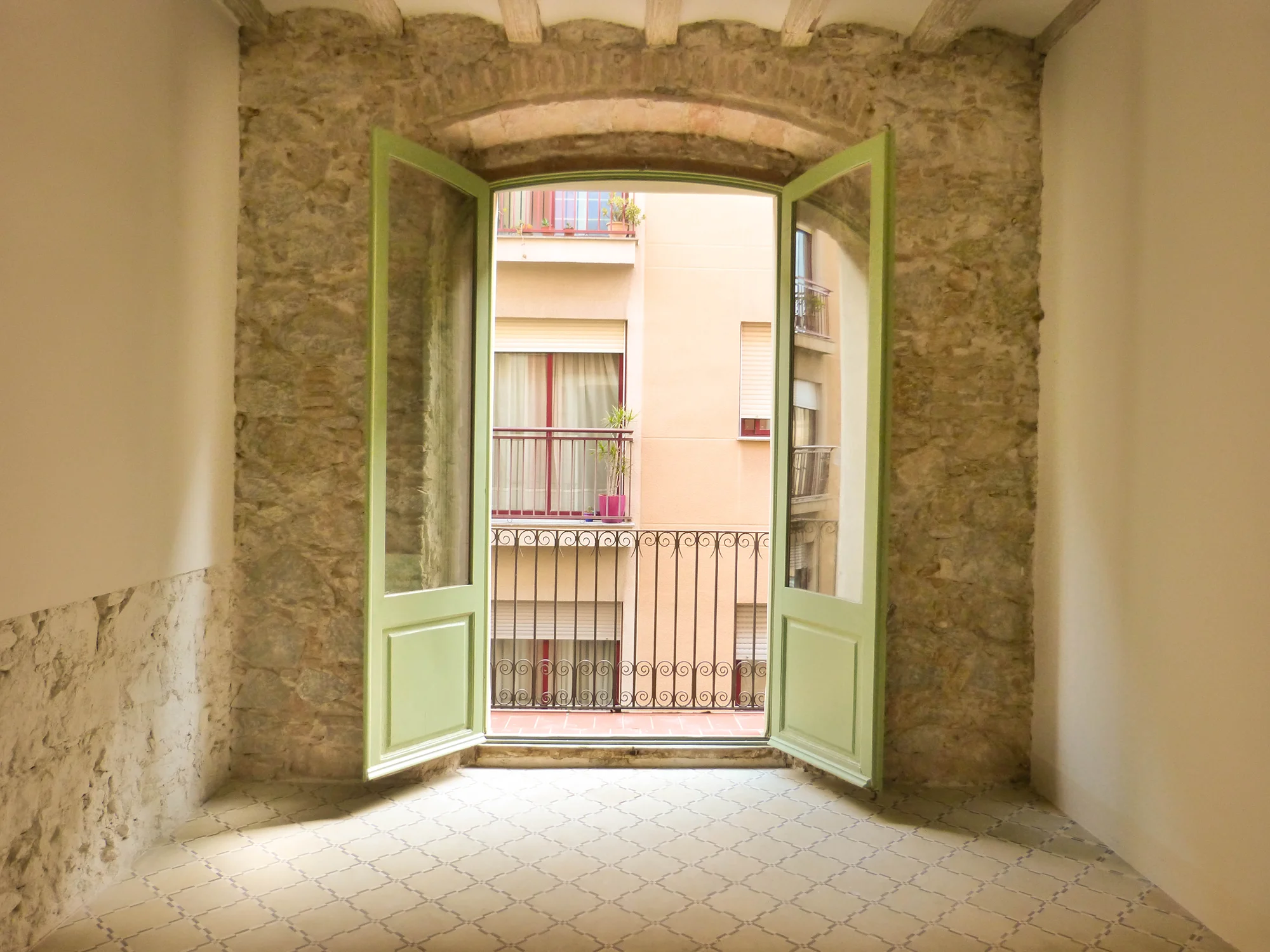 Apartments with exposed stone wall and hydraulic floor tiles.