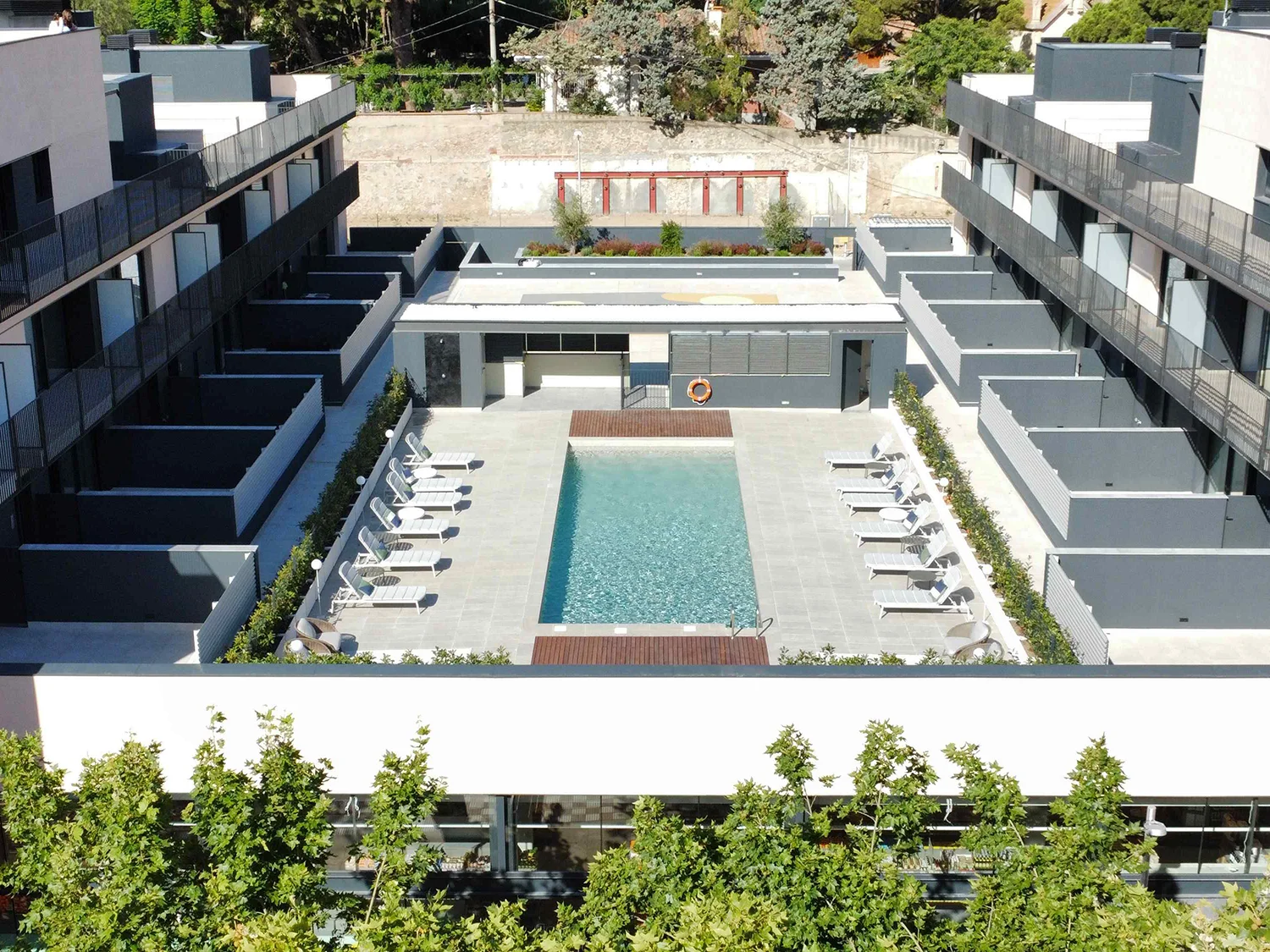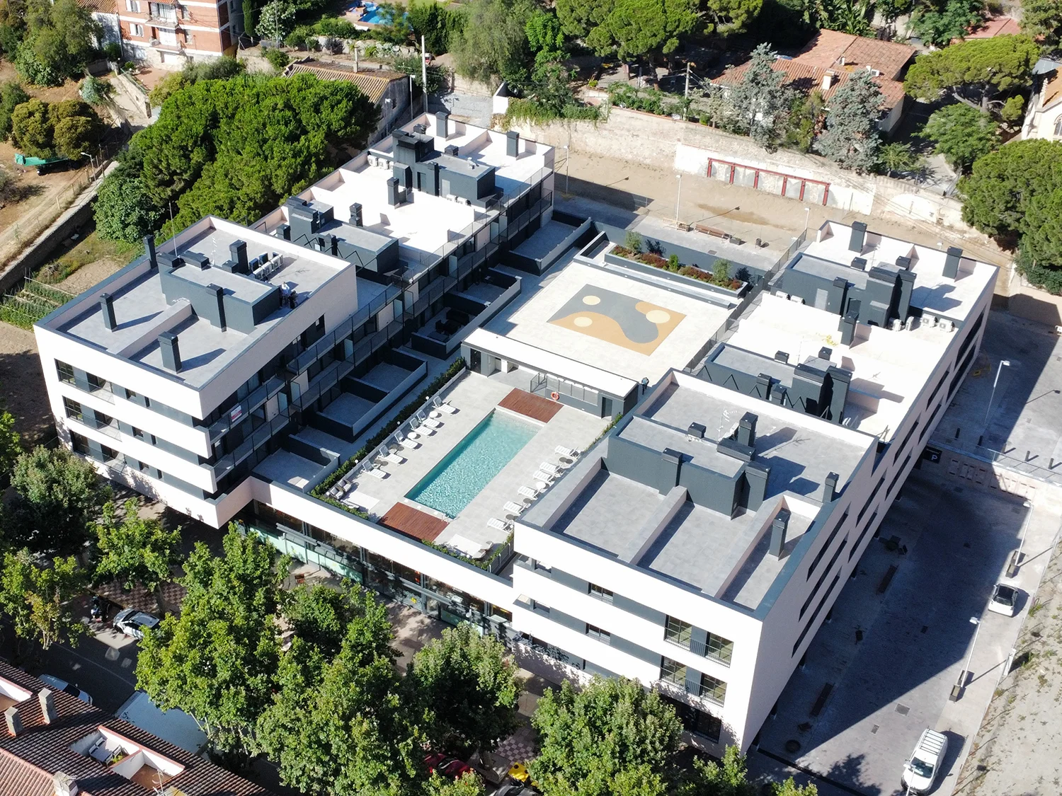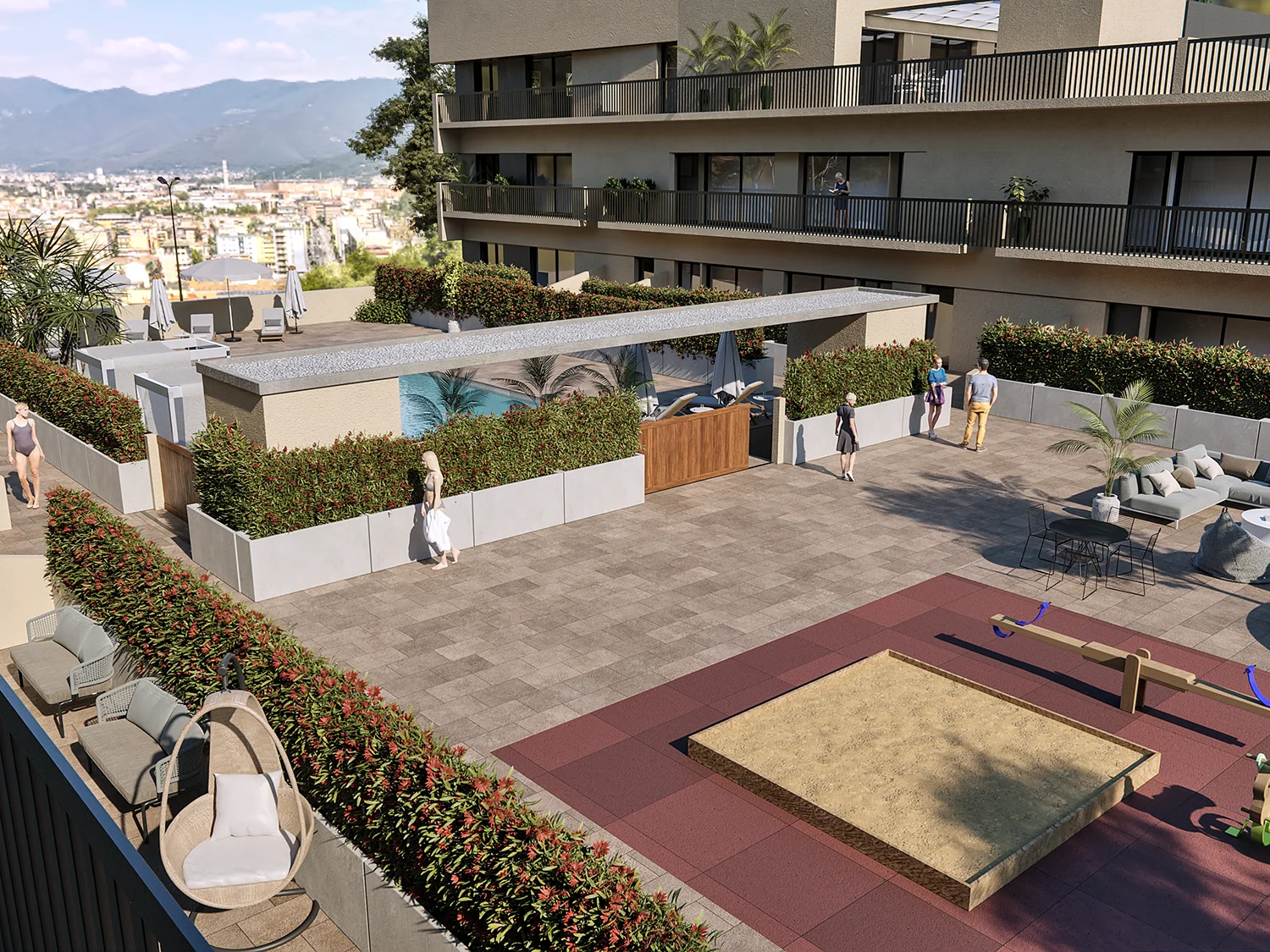 Each stairwell has its own elevator. The units are equipped with an aerothermal system distributed through air ducts, as well as electric blinds. The complex features a children’s play area and a communal swimming pool. The building also includes parking facilities.