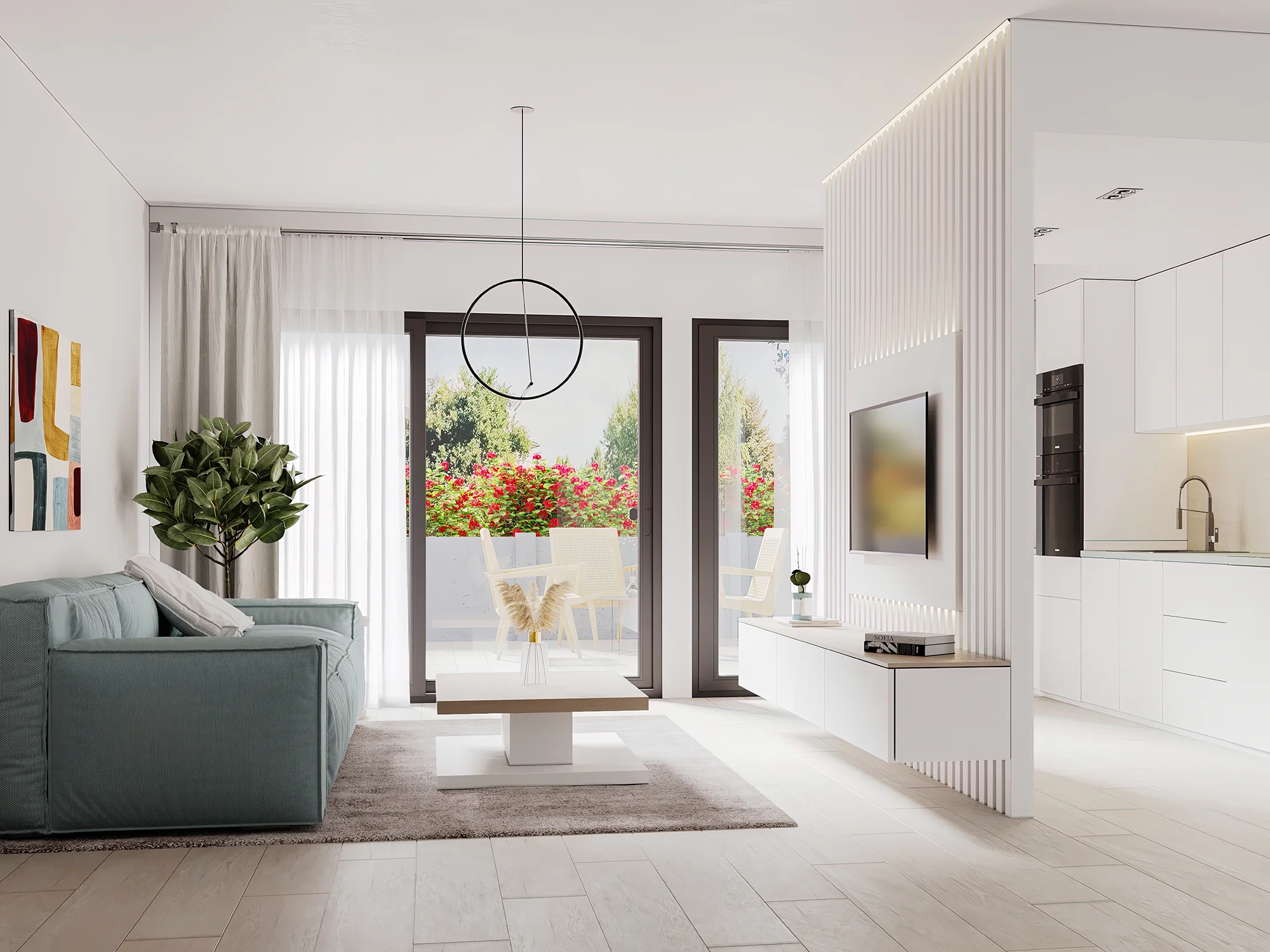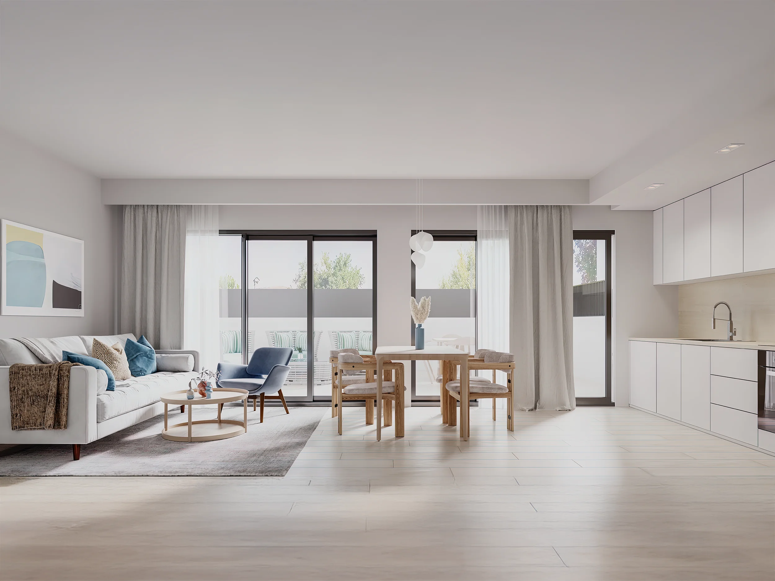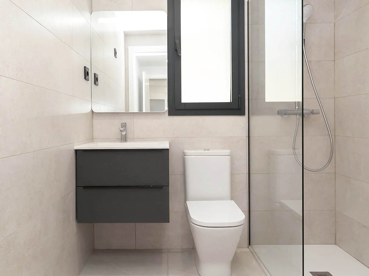 Each stairwell has its own elevator. The units are equipped with an aerothermal system distributed through air ducts, as well as electric blinds. The complex features a children’s play area and a communal swimming pool. The building also includes parking facilities.
